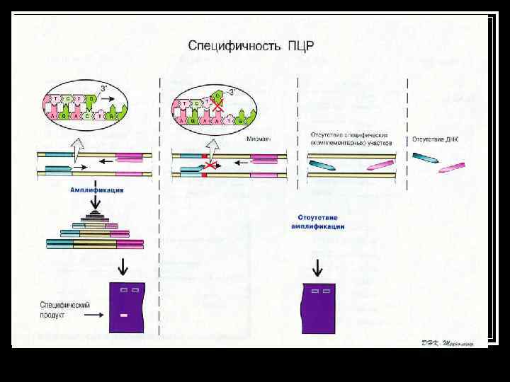 Преимущества ПЦР для диагностики инфекционных заболеваний n Высокая специфичность метода ПЦР обусловлена тем, что в исследуемом материале выявляется уникальный, характерный только для данного возбудителя фрагмент ДНК. Специфичность задается нуклеотидной последовательностью праймеров, что исключает возможность получения ложных результатов, в отличие от метода иммуноферментного анализа, где нередки ошибки в связи с перекрестно-реагирующими антигенами.
