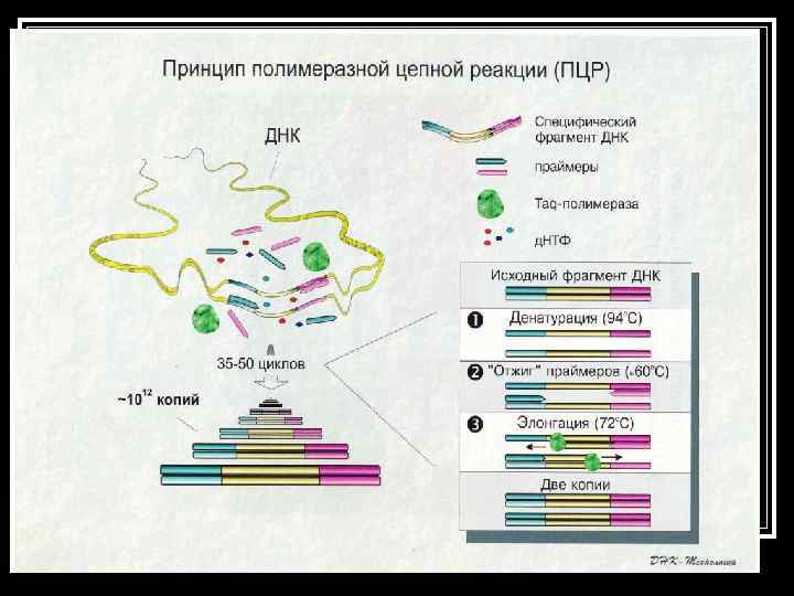 Репликация ДНК в клетке – прообраз полимеразной цепной реакции n n Полимеразная цепная реакция (ПЦР) – молекулярно-биологическая реакция, направленная на синтез большого количества копий специфического фрагмента ДНК in vitro. ПЦР представляет собой многократное увеличение числа копий (амплификация) специфического участка ДНК катализируемое ферментом ДНК- полимеразой.