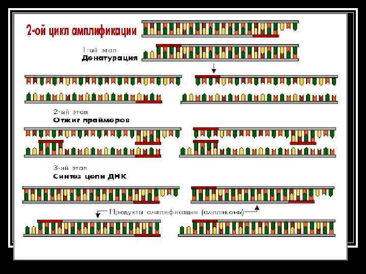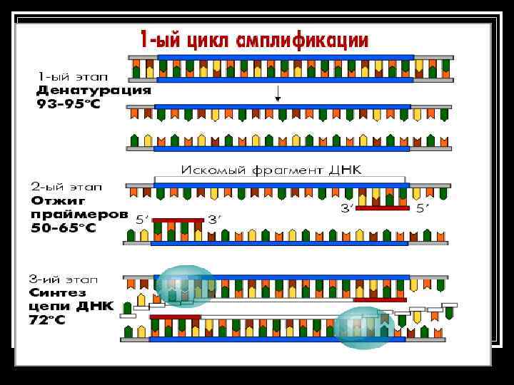 Этапы амплификации 1 этап: Денатурация ДНК n 2 этап: Присоединение праймеров (отжиг). n 3 этап: Достраивание цепей ДНК n