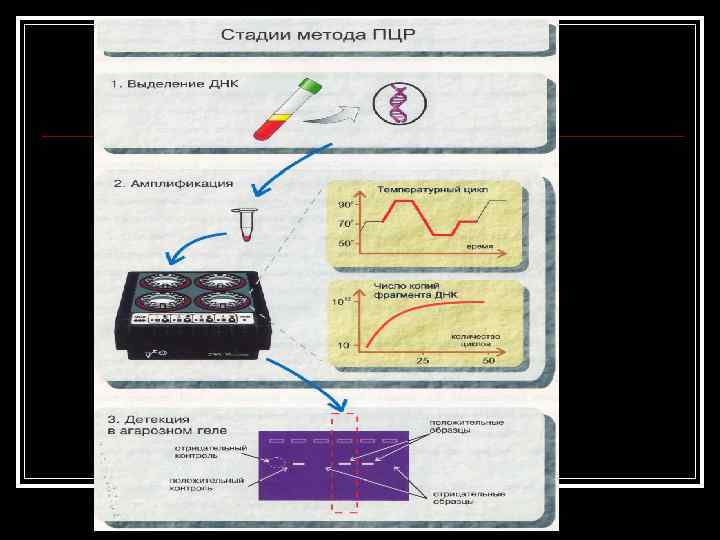 Методика проведения анализа с использованием метода ПЦР включает три этапа: 1. Выделение ДНК (РНК) из клинического образца n 2. Амплификация специфических фрагментов ДНК n 3. Детекция продуктов амплификации n