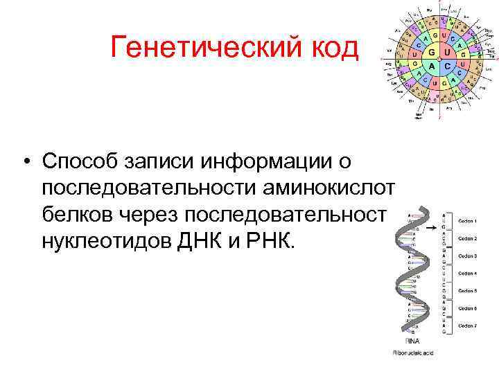Генетический код • Способ записи информации о последовательности аминокислот белков через последовательность нуклеотидов ДНК и РНК.