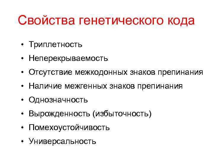 Свойства генетического кода • Триплетность • Неперекрываемость • Отсутствие межкодонных знаков препинания • Наличие межгенных знаков препинания • Однозначность • Вырожденность (избыточность) • Помехоустойчивость • Универсальность
