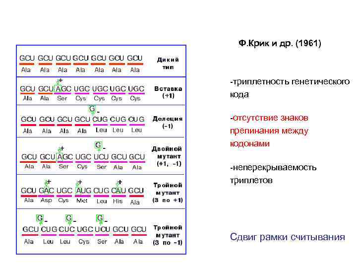 Ф. Крик и др. (1961) -триплетность генетического кода -отсутствие знаков препинания между кодонами -неперекрываемость триплетов Сдвиг рамки считывания