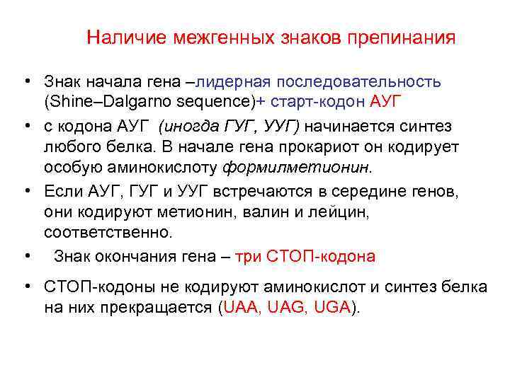 Наличие межгенных знаков препинания • Знак начала гена –лидерная последовательность (Shine–Dalgarno sequence)+ старт-кодон АУГ • с кодона АУГ (иногда ГУГ, УУГ) начинается синтез любого белка. В начале гена прокариот он кодирует особую аминокислоту формилметионин. • Если АУГ, ГУГ и УУГ встречаются в середине генов, они кодируют метионин, валин и лейцин, соответственно. • Знак окончания гена – три СТОП-кодона • СТОП-кодоны не кодируют аминокислот и синтез белка на них прекращается (UAA, UAG, UGA).