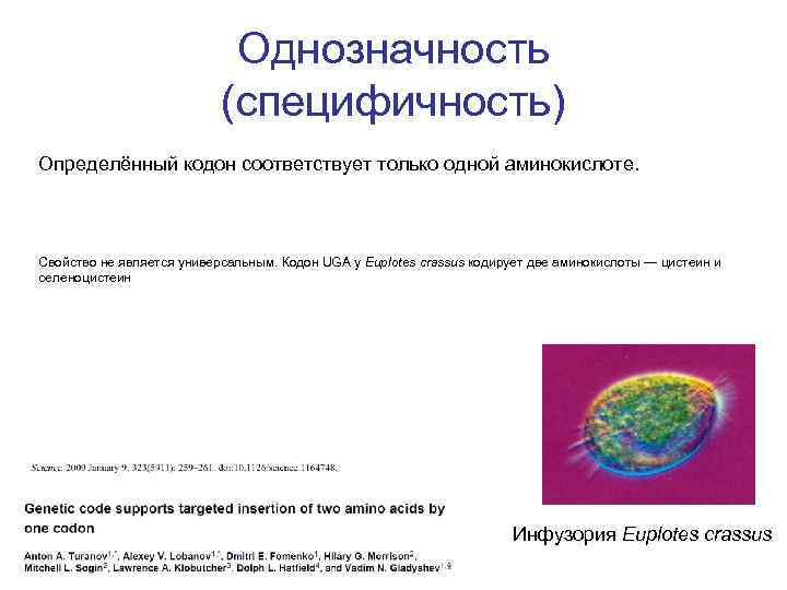 Однозначность (специфичность) Определённый кодон соответствует только одной аминокислоте. Свойство не является универсальным. Кодон UGA у Euplotes crassus кодирует две аминокислоты — цистеин и селеноцистеин Инфузория Euplotes crassus
