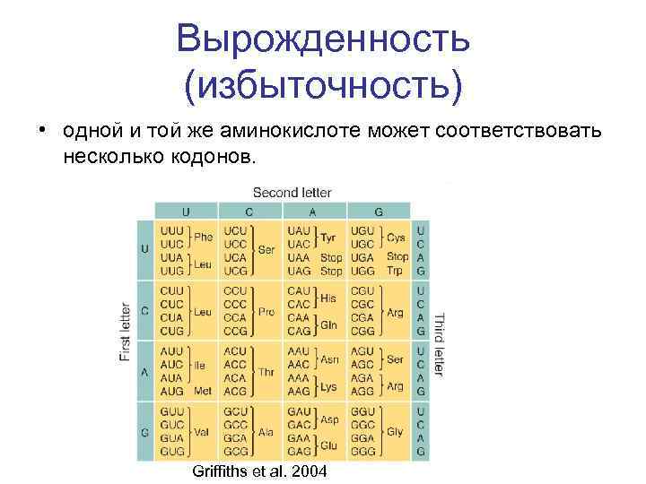Вырожденность (избыточность) • одной и той же аминокислоте может соответствовать несколько кодонов. Griffiths et al. 2004