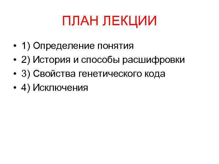 ПЛАН ЛЕКЦИИ • • 1) Определение понятия 2) История и способы расшифровки 3) Свойства генетического кода 4) Исключения