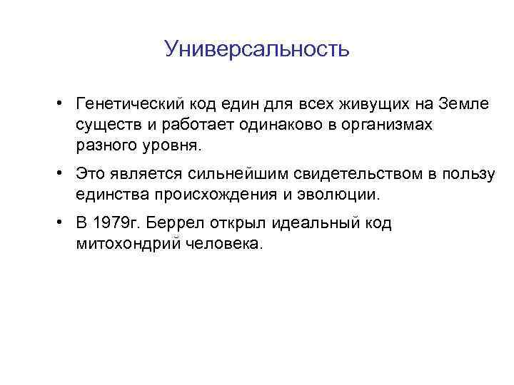 Универсальность • Генетический код един для всех живущих на Земле существ и работает одинаково в организмах разного уровня. • Это является сильнейшим свидетельством в пользу единства происхождения и эволюции. • В 1979 г. Беррел открыл идеальный код митохондрий человека.