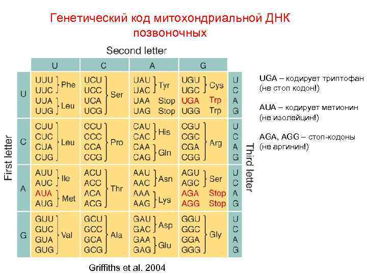 Генетический код митохондриальной ДНК позвоночных UGA – кодирует триптофан (не стоп кодон!) AUA – кодирует метионин (не изолейцин!) AGA, AGG – стоп-кодоны (не аргинин!) Griffiths et al. 2004