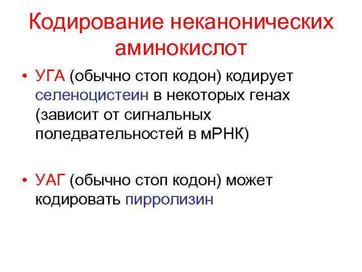 Кодирование неканонических аминокислот • УГА (обычно стоп кодон) кодирует селеноцистеин в некоторых генах (зависит от сигнальных поледвательностей в м. РНК) • УАГ (обычно стоп кодон) может кодировать пирролизин