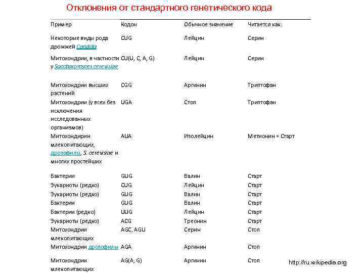 Отклонения от стандартного генетического кода Пример Кодон Обычное значение Читается как: Некоторые виды рода дрожжей Candida CUG Лейцин Серин Митохондрии, в частности CU(U, C, A, G) у Saccharomyces cerevisiae Лейцин Серин Митохондрии высших CGG растений Митохондрии (у всех без UGA исключения исследованных организмов) Митохондирии AUA млекопитающих, дрозофилы, S. cerevisiae и многих простейших Аргинин Триптофан Стоп Триптофан Изолейцин Метионин = Старт Бактерии Эукариоты (редко) Бактерии (редко) Эукариоты (редко) Митохондрии млекопитающих Митохондрии дрозофилы GUG CUG GUG UUG ACG AGC, AGU Валин Лейцин Треонин Серин Старт Старт Стоп AGA Аргинин Стоп Митохондрии млекопитающих AG(A, G) Аргинин Стоп http: //ru. wikipedia. org