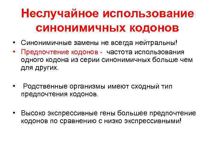 Неслучайное использование синонимичных кодонов • Синонимичные замены не всегда нейтральны! • Предпочтение кодонов - частота использования одного кодона из серии синонимичных больше чем для других. • Родственные организмы имеют сходный тип предпочтения кодонов. • Высоко экспрессивные гены большее предпочтение кодонов по сравнению с низко экспрессивными!