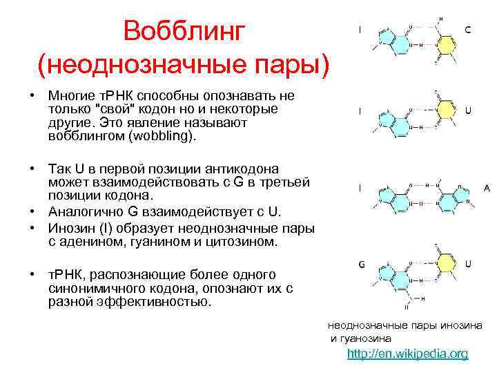 Вобблинг (неоднозначные пары) • Многие т. РНК способны опознавать не только "свой" кодон но и некоторые другие. Это явление называют вобблингом (wobbling). • Так U в первой позиции антикодона может взаимодействовать с G в третьей позиции кодона. • Аналогично G взаимодействует с U. • Инозин (I) образует неоднозначные пары с аденином, гуанином и цитозином. • т. РНК, распознающие более одного синонимичного кодона, опознают их с разной эффективностью. неоднозначные пары инозина и гуанозина http: //en. wikipedia. org
