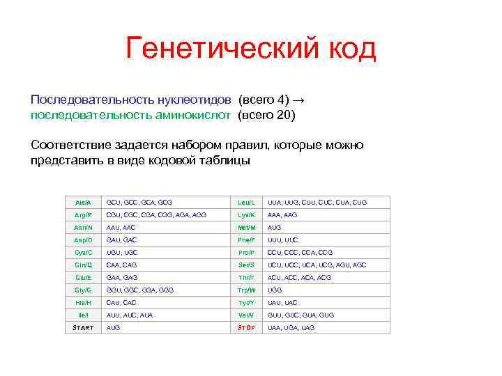 Генетический код Последовательность нуклеотидов (всего 4) → последовательность аминокислот (всего 20) Соответствие задается набором правил, которые можно представить в виде кодовой таблицы Ala/A GCU, GCC, GCA, GCG Leu/L UUA, UUG, CUU, CUC, CUA, CUG Arg/R CGU, CGC, CGA, CGG, AGA, AGG Lys/K AAA, AAG Asn/N AAU, AAC Met/M AUG Asp/D GAU, GAC Phe/F UUU, UUC Cys/C UGU, UGC Pro/P CCU, CCC, CCA, CCG Gln/Q CAA, CAG Ser/S UCU, UCC, UCA, UCG, AGU, AGC Glu/E GAA, GAG Thr/T ACU, ACC, ACA, ACG Gly/G GGU, GGC, GGA, GGG Trp/W UGG His/H CAU, CAC Tyr/Y UAU, UAC AUU, AUC, AUA Val/V GUU, GUC, GUA, GUG AUG STOP UAA, UGA, UAG Ile/I START