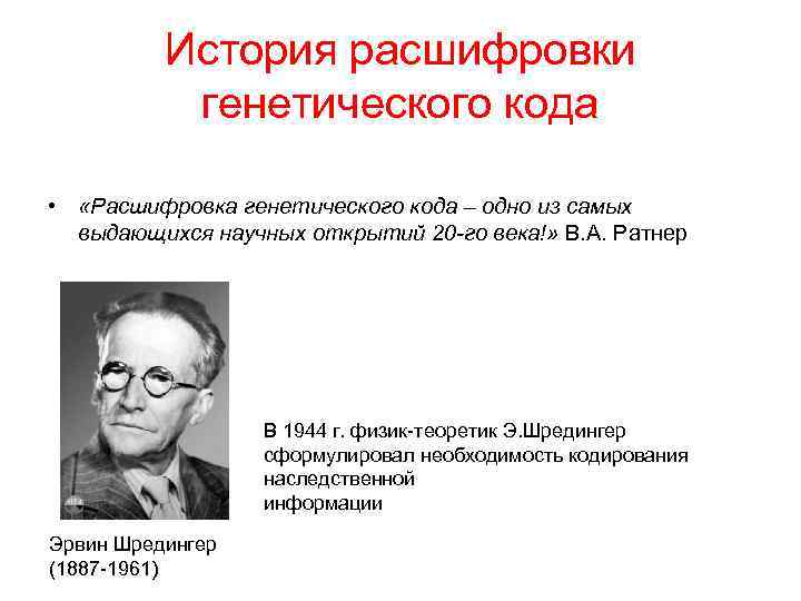 История расшифровки генетического кода • «Расшифровка генетического кода – одно из самых выдающихся научных открытий 20 -го века!» В. А. Ратнер В 1944 г. физик-теоретик Э. Шредингер сформулировал необходимость кодирования наследственной информации Эрвин Шредингер (1887 -1961)