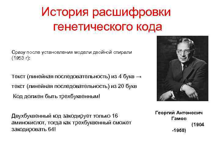 История расшифровки генетического кода Сразу после установления модели двойной спирали (1953 г): Текст (линейная последовательность) из 4 букв → текст (линейная последовательность) из 20 букв Код должен быть трехбуквенным! Двухбуквенный код закодирует только 16 аминокислот, тогда как трехбуквенный сможет закодировать 64! Георгий Антонович Гамов (1904 -1968)