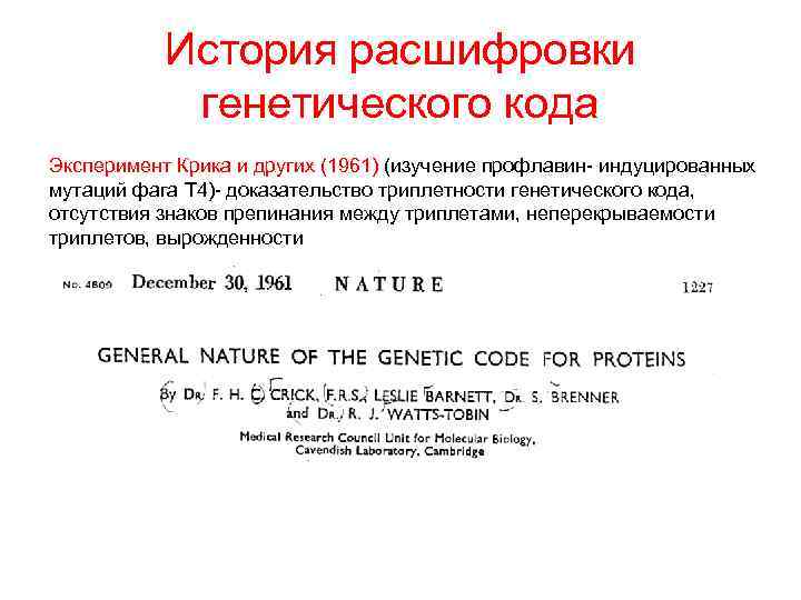 История расшифровки генетического кода Эксперимент Крика и других (1961) (изучение профлавин- индуцированных мутаций фага T 4)- доказательство триплетности генетического кода, отсутствия знаков препинания между триплетами, неперекрываемости триплетов, вырожденности