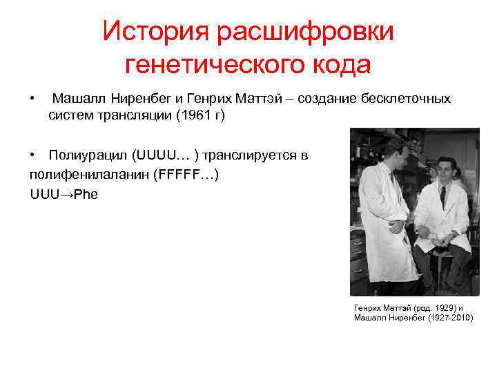 История расшифровки генетического кода • Машалл Ниренбег и Генрих Маттэй – создание бесклеточных систем трансляции (1961 г) • Полиурацил (UUUU… ) транслируется в полифенилаланин (FFFFF…) UUU→Phe Генрих Маттэй (род. 1929) и Машалл Ниренбег (1927 -2010)