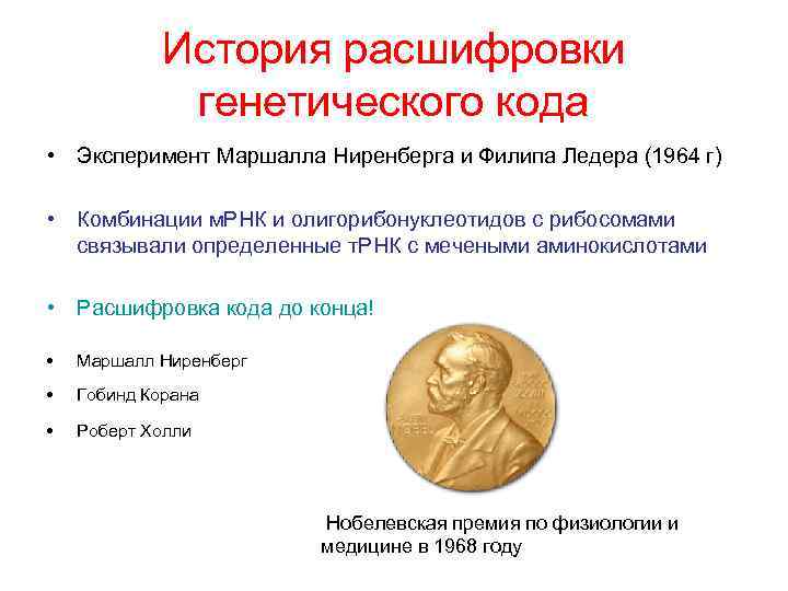 История расшифровки генетического кода • Эксперимент Маршалла Ниренберга и Филипа Ледера (1964 г) • Комбинации м. РНК и олигорибонуклеотидов с рибосомами связывали определенные т. РНК с мечеными аминокислотами • Расшифровка кода до конца! • Маршалл Ниренберг • Гобинд Корана • Роберт Холли Нобелевская премия по физиологии и медицине в 1968 году