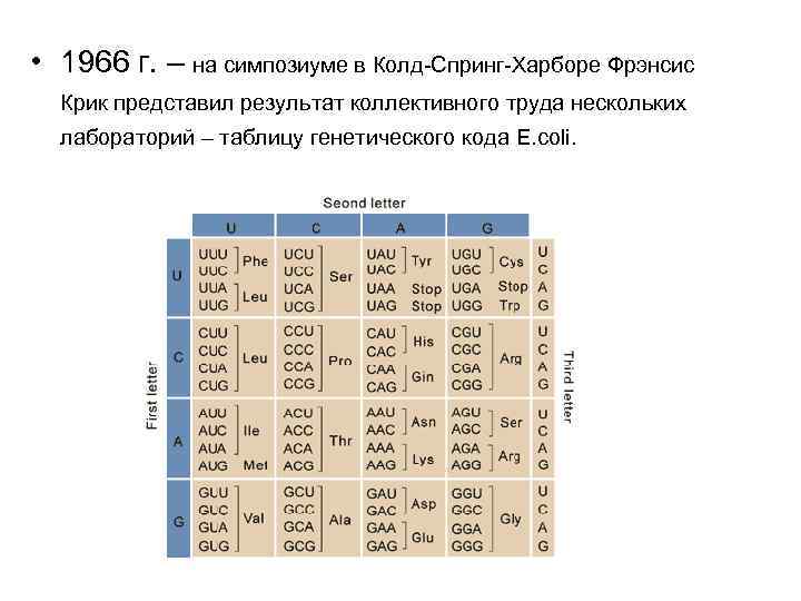• 1966 г. – на симпозиуме в Колд-Спринг-Харборе Фрэнсис Крик представил результат коллективного труда нескольких лабораторий – таблицу генетического кода E. coli.