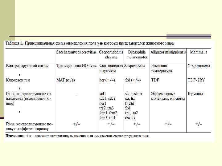 Принцип Жоста “Хромосомный пол, связанный с присутствием или отсутствием Yхромосомы, определяет дифференциацию эмбриональной гонады, которая, в свою очередь, контролирует фенотипический пол организма” ESD (Environmental Sex Determination ) GSD (Genetic Sex Determination ) CSD (Complementary Sex Determination )
