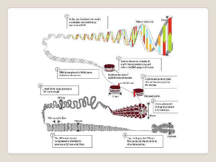 В процессе клеточного цикла хроматин претерпевает несколько уровней спирализации (компактизации): нуклеосомная нить, хроматиновая фибрилла, хромомеры, хромонемы, хроматиды. В ядрах клетки человека суммарная длина ДНК составляет почти 2 метра. Диаметр ядра - 5 -10 микрон, то есть в миллион раз меньше длины ДНК Самая маленькая хромосома человека - 22 я, составляет около 1, 4 см в длину и содержит 4, 6 ∙ 107 пар оснований. Для размещения молекулы ДНК на метафазной пластинке в процессе митоза, уменьшения риска спутывания или разрыва ДНК, необходимо упаковать ее в более короткие пучки – хромосомы. К концу профазы митоза 22 я хромосома укорачивается до 2 мкм, то есть в 7000 раз. Для достижения такого уровня компактизации и одно -временно сохранения эффективности основных генети - ческих процессов, требующих локальной распаковки, структура метафазной хромосомы должна пройти неско- лько уровней компактизации, что является основой складчато-петлевой модели структуры хромосомы