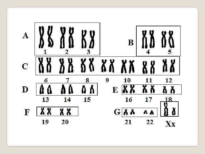 Хромосомный набор или кариотип человека включает 46 хромосом - 22 пары аутосом и 1 пару половых хромосом (XX- у лиц женского пола и XY - мужского). В кариотипе человека были выделены 7 групп аутосом и половые хромосомы X и Y. Хромосомы расположены по мере убывания их размеров. Группам аутосом были присвоены буквенные обозначения : А (1– 3), B (4– 5), C(6– 12), D (13– 15), E (16– 18), F (19– 20), G (21– 22). Х-хромосома относится к С-группе, Y – к G-группе. В скобках указаны номера хромосом каждой группы. Каждая пара хромосом идентифицируется по размеру и положению центромеры (метацентрические, субметацентрические, акроцентрические).