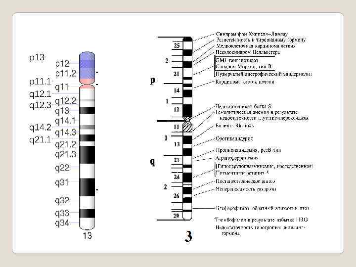 Гены распределены по 24 хромосом. Расположение генов на хромосоме чередуется: участки с плотной локализацией (богатые генами) разделены участками бедными генами ( «генные пустыни» ). Наибольшую плотность имеет хромосома 19, наименьшую 13 и У-хромосома. Различается плотность и в разных частях хромосомы: в 21 хромосоме в длинном плече плотность в прокси мальном отделе составляет 1 ген на 304 т. п. н, а в дистальном – 1 на 64 т. н. п. ; в других участках длинного плеча генов практически нет Сотни генов вероятно получены человеком в результате горизонтальный передачи от бактерий. 6500 генов установлены экспе риментально (по функции продукта, наличию мутаций, тканеспеци фичности и т. д. ). Хромосомная локализация выявлена для около 20 тыс. генов (из них 740 генов РНК). Идентифицированы гены прак тически всех наиболее часто встречаемых (320) и сравнительно ред ких (около 170) наследственных заболеваний, 130 онкогенов. Общее количество генов обеспечивающих развитие наследствен ных болезней составляет 1400.