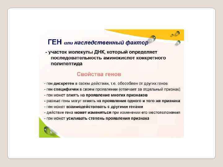 Свойства гена: 1. Ген хранит и передает информацию. 2. Ген способен к изменению. генетической информации (мутации). 3. Ген способен к репарации и ее передаче от поколения к поколению. 4. Ген способен к реализации - синтезу белка. 5. Генетический материал обладает устойчивостью.