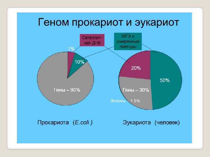 Геном эукариот характеризуется сложностью, плотностью генов, наличием интронов. Геном эукариот Сложность ДНК характеризуется общей длиной (в н. п. ) разных последовательнос- тей ДНК, определяющих ее избыточность. Размер генома человека составляет 3, 2∙ 109 н. п. По результатам выполнения проекта «Геном человека» (2001 г. ) 1 -2% генома составляют кодирующие экзоны, 24% - интроны и 75% - межгенные промежутки. Только 1 -2% генома несет информа цию о структуре белков. Следовательно, большая часть генома составляет избыточную, не кодирующую последовательность ДНК. Этот феномен получил название «парадокс С» .