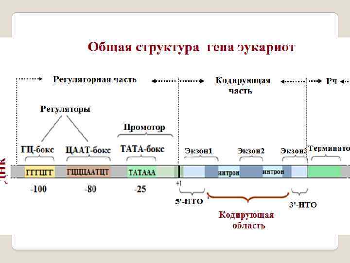 Мозаичное строение генов эукариот. Тонкая структура гена Р. Робетсон и Ф. Шарп установили факт существования расщепленных генов, то есть, генов, состоящих из кодирующих и некодирующих последовательности нуклеотидов. Они были названы, экзонами и интронами. Экзоны – это кодирующие последовательности нук леотидов, а интроны – некодирующие последовательности. Интрон экзонная структура гена характерна для генов эукариот.