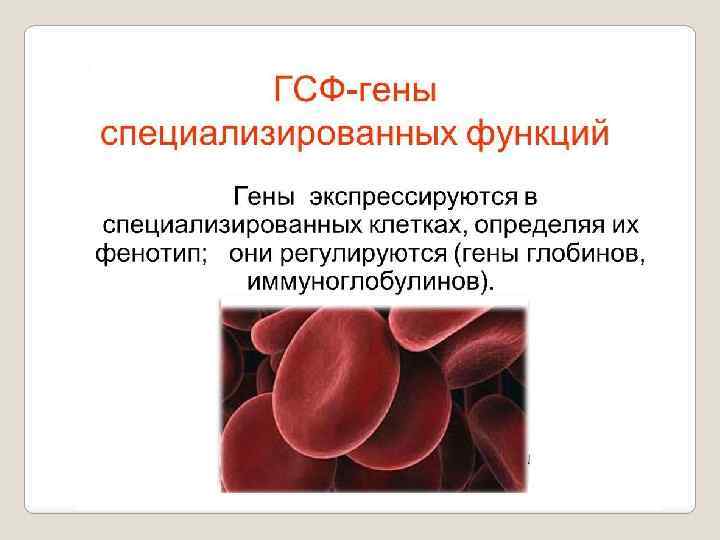 Гены «роскоши» ГСФ гены контролируют строго спе циализированные, специфические функции клетки. На организменном уровне имеются собственные системы жизнеобеспечения, развития, размножения, дыхания и т. д. Поэтому любая клетка организма должна поддерживать не толь ко свои жизненные потенции (которые обеспечивают ГОФ ге ны), но и принимать участие в жизнедеятельности всего ор ганизма. Последним и занимаются специализированные гены – гены «роскоши» . Эти гены контролируют белки, которые обеспечи вают функционирование физиологических систем организма – его защитных свойств, процессов дыхания, выделе ния, кровоснабжения, пищеварения и т. д. ). К таким генам относятся гены, контролирующие синтез ге моглобина, иммуноглобулина и др. В отличии от генов «домаш него хозяйства» «гены роскоши» находятся под жёстким конт ролем организма и имеют сложный аппарат регуляции.