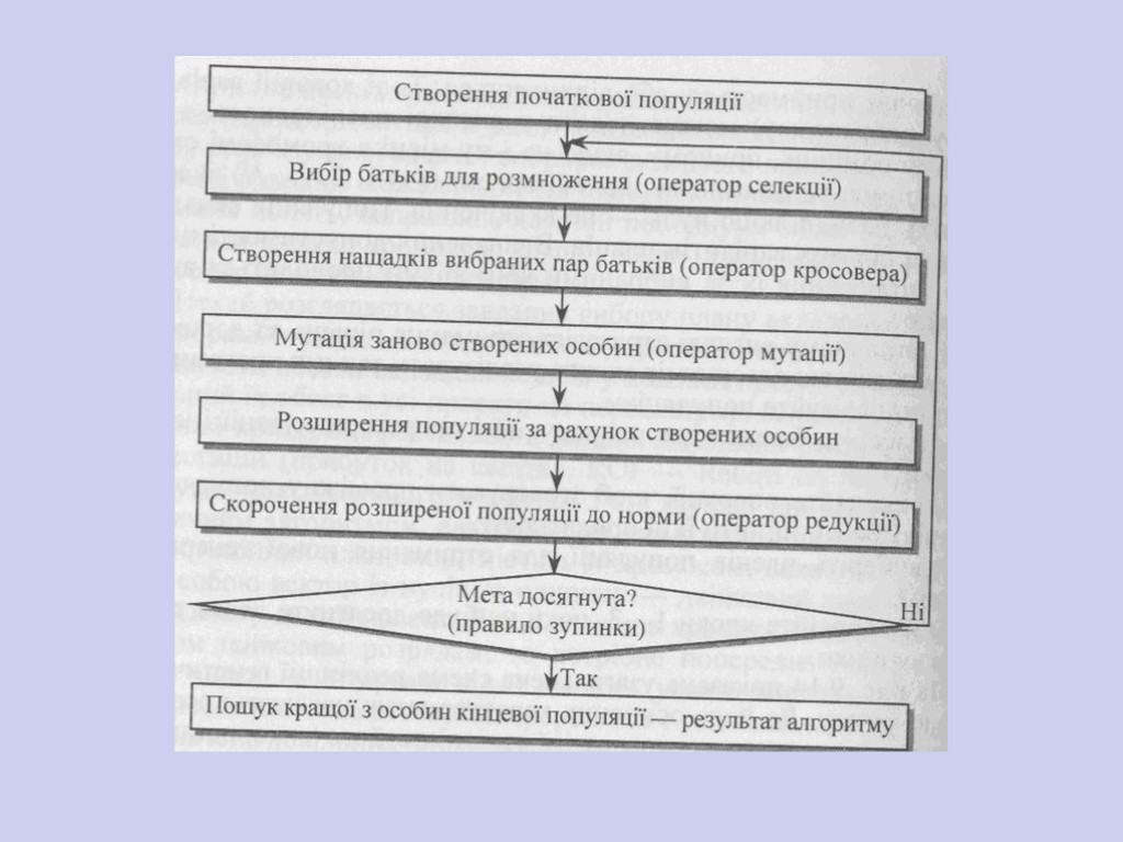 У загальному вигляді стратегію отримання рішень за допомогою генетичних алгоритмів можна реалізувати такими кроками: 1) ініціалізуйте популяцію; 2) виберіть батьків для репродукції і оператори мутації і кросовера; 3) виконайте операції, щоб згенерувати проміжну популяцію індивідуумів і оцінити їхні придатності; 4) виберіть членів популяції для отримання нової генерації (версії); 5) повторюйте кроки 1—З, поки не буде досягнуте деяке правило зупинки. На рис. 10 показана узагальнена схема реалізації генетичного алгоритму. До його основних характеристик належать: розмір популяції, оператор кросовера і ймовірність його використання, оператор мутації і її ймовірність, оператор селекції, оператор редукції, правило (критерій) зупинки процесу виконання генетичного алгоритму. Оператори селекції, кросовера, мутації і редукції ще називають генетичними операторами.