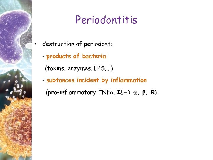 Periodontitis • destruction of periodont: - products of bacteria (toxins, enzymes, LPS, . . . ) - subtances incident by inflammation (pro-inflammatory TNF , IL-1 , , R)
