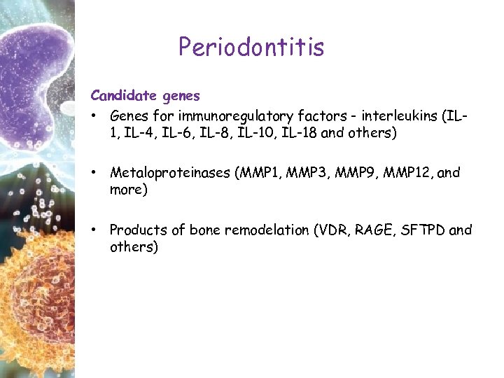 Periodontitis Candidate genes • Genes for immunoregulatory factors - interleukins (IL 1, IL-4, IL-6, IL-8, IL-10, IL-18 and others) • Metaloproteinases (MMP 1, MMP 3, MMP 9, MMP 12, and more) • Products of bone remodelation (VDR, RAGE, SFTPD and others)