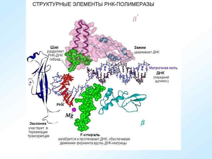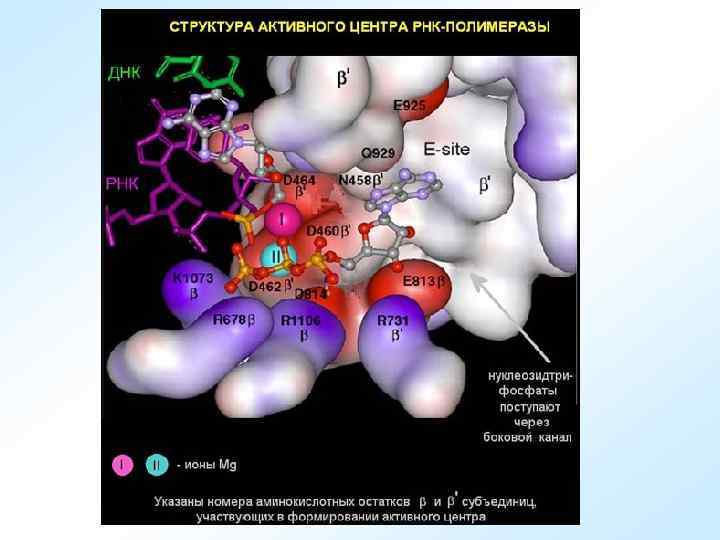 Биосинтез белка. Транскрипция (переписывание) – синтез на ДНК–матрице м. РНК (первичного продукта гена), осуществляющийся в ядре на смысловой нити ДНК, находящейся в деспирализованном состоянии. В процессе транскрипции можно выделить три этапа. 1 - инициация транскрипции начало синтеза нити РНК, образуется первая связь между нуклеотидами. 2 - элонгация - наращивание нити, ее удлинение, 3 - терминация - синтез завершен, происходит, освобождение синтезированной РНК.