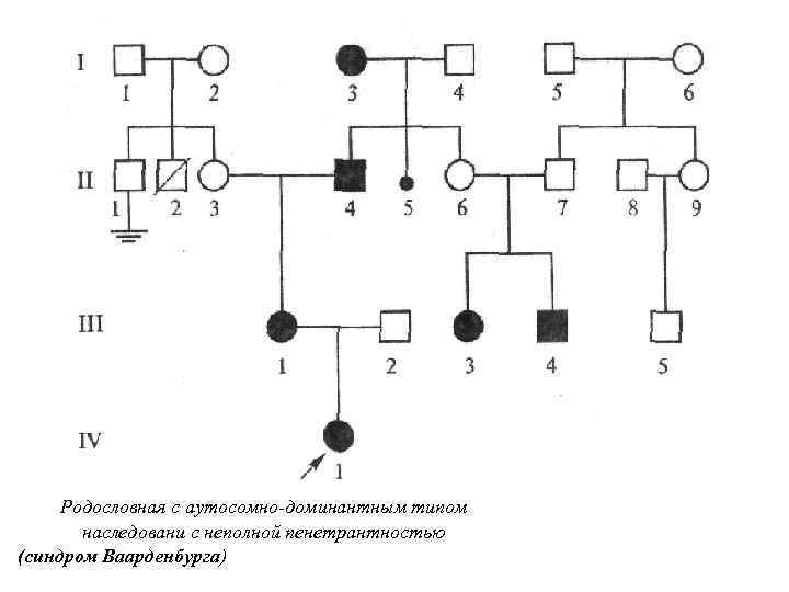 Родословная с аутосомно доминантным типом наследовани с неполной пенетрантностью (синдром Ваарденбурга)
