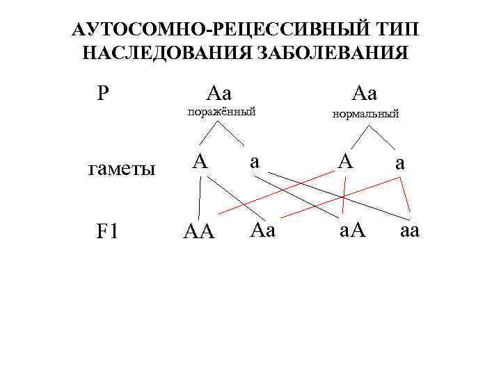 АУТОСОМНО РЕЦЕССИВНЫЙ ТИП НАСЛЕДОВАНИЯ ЗАБОЛЕВАНИЯ Р гаметы F 1 Аа поражённый А АА Аа нормальный а Аа а. А аа