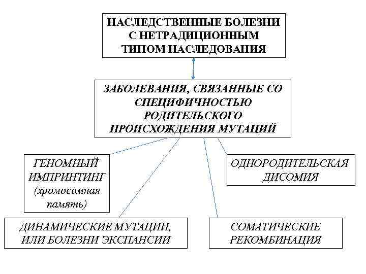 НАСЛЕДСТВЕННЫЕ БОЛЕЗНИ С НЕТРАДИЦИОННЫМ ТИПОМ НАСЛЕДОВАНИЯ ЗАБОЛЕВАНИЯ, СВЯЗАННЫЕ СО СПЕЦИФИЧНОСТЬЮ РОДИТЕЛЬСКОГО ПРОИСХОЖДЕНИЯ МУТАЦИЙ ГЕНОМНЫЙ ИМПРИНТИНГ (хромосомная память) ДИНАМИЧЕСКИЕ МУТАЦИИ, ИЛИ БОЛЕЗНИ ЭКСПАНСИИ ОДНОРОДИТЕЛЬСКАЯ ДИСОМИЯ СОМАТИЧЕСКИЕ РЕКОМБИНАЦИЯ