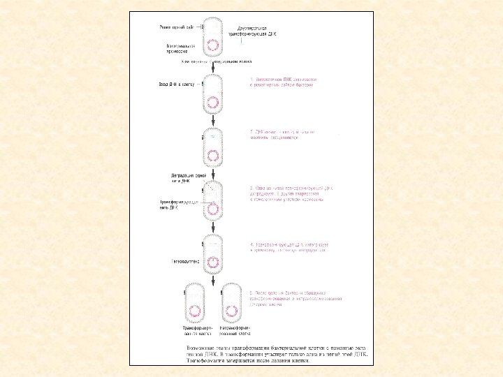 Механізм бактеріальної трансформації У результаті трансформації відбувається генетична рекомбінація між бактеріальними клітинами. Невеликі фрагментипозаклітинної ДНК потрапляють у бактерію й забезпечують клітині реципієнту нові властивості Трансформаціявикористовується для картируванні бактеріальних генів, хоча й меншою мірою , ніж кон'югація. Процес трансформації включає кілька етапів, суть яких (1) у потраплянні фрагментів ДНК у клітину реципієнта й (2) у рекомбінації між цієї ДНК і гомологічними генами реципієнта. Позахромосомна ДНК може проникнути тільки в компетентні клітини, що несуть на своїй поверхні кілька рецепторних сайтів. Для проходження ДНК крізь клітинну стінку й мембрану потрібні енергія й спеціальні транспортні білки, оскільки пригничення синтезу білків і багатих енергією молекул у клітині реципієнті інгібує й сам процес трансформації. Після надходження фрагмента ДНК у бактеріальну клітину одна з ниток дву спіральної молекули руйнується нуклеазами, а інша бере участь у трансформації (кроки 2 3). нитка, що залишився, ДНК утворює синапс із гомологічною ділянкою хромосоми й рекомбінує з ним (крок 4). Заміщена ділянка бактеріальної хромосоми деградує. Рекомбінація виявляється в тому випадку, якщо ДНК отримана бактерією від клітини іншого штаму, несушею інші гени або мутацію. Після інтеграції чужорідної ДНК у бактеріальну хромосому вона несе один вихідний ланцюг ДНК і одну чужу (наприклад, мутантний ген), така структура називається гетеродуплексом. Якщо в ДНК дикого типувбудовується мутантний ген, то виходять инсерционные мутанти. У результаті напівконсервативної реплікації, хромосома однієї з дочірніх кліток ідентична вихідної, а хромосома іншої містить чужий (мутантний) ген, тобтоутворюється одна трансформована й одна нетрансформована клітина (крок 5)