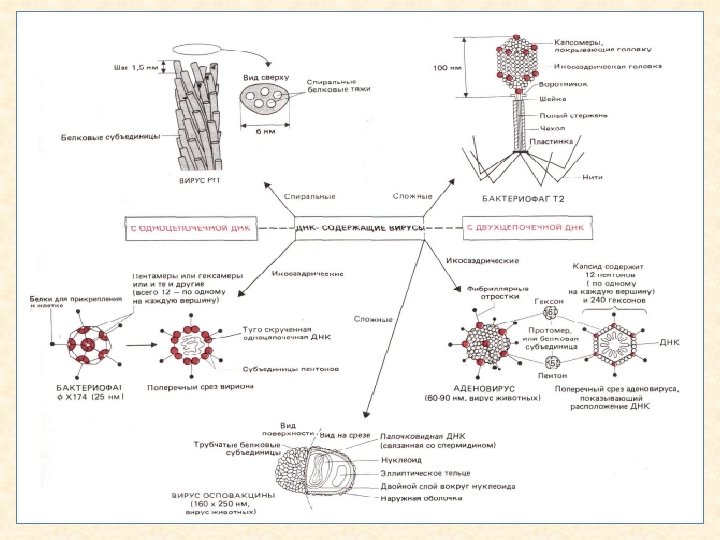 Віруси частки, що містять нуклеїнові кислоти, білки, а іноді й ліпіди й здатні розмножуватися лише в клітині хазяїні. Поза клітиною віруси можуть перебувати тільки у нереплікативному стані, оскільки в більшості з них немає ферментів, необхідних для повного відтворення зрілої вірусної частки. Діаметр вірусних часток (їх називають також віріонами) рівний 20 300 нм. Таким чином, вони набагато менше, ніж навіть дрібні із прокаріотичних клітин. Тому що розміри білків і деяких нуклеїновых кислот перебувають у діапазоні 2 50 нм, вірусну частку можна було б вважати просто комплексом макромолекул. Через їхні малі розміри й нездатність до самовідтворення віруси часто відносять до розряду «неживого» . ДНК містячі віруси несуть як генетичний матеріал або одно , або двох ланцюгову ДНК, що може бути як лінійної, так і кільцевий. У ДНК закодована інформація про всі білки вірусу. Віруси класифікують залежно від того, одне або двох ланцюгова в них ДНК і про або еукаріотичною є клітина хазяїн. Віруси, що заражають бактерії, називаються бактеріофагами. Структура вірусу в принципі така: це молекула ДНК у білковій «обгортці» , навываемой «капсидом» .