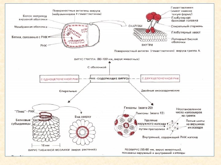 РНК-містячі віруси не мають ДНК: генетична інформація цих вірусів закодована в РНК може бути одне або двох ланцюговою, а клітина хазяїн про або еукаріотичною. Тільки віруси з одноланцюговою РНК заражають бактерії, тоді як віруси рослин і тварин можуть бути як одно , так і двохланцюгові. Віруси з одноланцюговою РНК можна розділити на два типи: з «плюс» ланцюгом і «мінус» ланцюгом. У вірусів першого типу ланцюг РНК може функціонувати в клітині хазяїні безпосередньо як м. РНК, тоді як у вірусів другого типу на «мінус» ланцюга повинна спочатку за допомогою клітинних РНК полімераз утворитися «плюс» ланцюг. Віруси тварин бувають як першого, так і другого типів, а більшість вірусів рослин ставиться до «плюс» типу. Особливий клас «плюс» одноланцюгових вірусів утворять ретровіруси, які здатні заражати тільки клітини тварин.