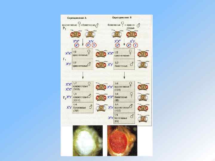 Если же скрестить между собой белоглазых самок и красноглазых самцов (реципрокное скрещивание), то в первом поколении все самки оказываются красноглазыми, а самцы белоглазыми. В F 2 половина самок и самцов — красноглазые, половина — белоглазые. Объяснить полученные результаты наблюдаемого расщепления по окраске глаз Т. Морган смог, только предположив, что ген, отвечающий за окраску глаз, локализован в Х-хромосоме, а Yхромосома таких генов не содержит. Таким образом, благодаря проведенным скрещиваниям, был сделан очень важный вывод: ген цвета глаз сцеплен с полом, то есть находится в Х-хромосоме.