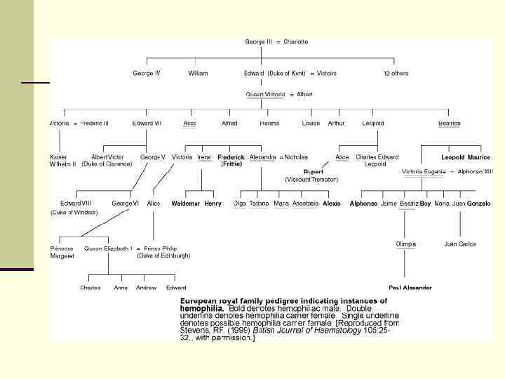 Х-сцепленный рецессивный тип наследования n Х-сцепленный рецессивный тип наследования характеризуется следующими признаками: 1) больные появляются не в каждом поколении; 2) больной ребенок рождается у здоровых родителей; 3) болеют преимущественно мужчины; 4) проявление признака (болезни) наблюдается преимущественно по горизонтали; 5) вероятность наследования — у 25 % всех детей, в том числе у 50 % мальчиков; 6) здоровые мужчины не передают болезни. Так наследуются у человека гемофилия, дальтонизм, умственная отсталость с ломкой Х-хромосомой, мышечная дистрофия Дюшенна, синдром Леша-Найхана и др.