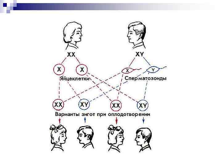 Хромосомное определение пола у человека Р : ♀46, ХХ G : 22+Х F 1 : 46, ХХ х ♂ 46, ХY 22+Х, 22+Y 46, ХY