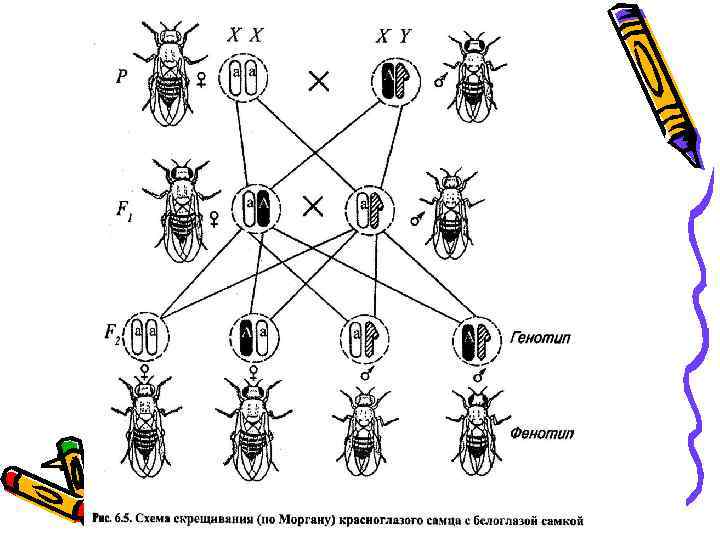 Сцепленные с полом признаки у дрозофилы • В лаборатории Т. Моргана у дрозофилы была обнаружена рецессивная мутация white – белые глаза (W – дикий признак – красные глаза). При реципрокных скрещиваниях мух с красными и белыми глазами были получены. различные результаты: