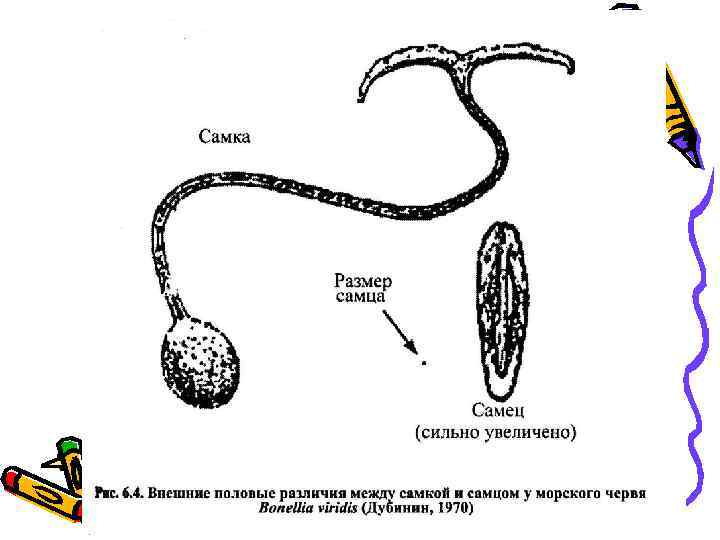 Эпигамия • Пол определяется после оплодотворения в зависимости от условий, в которых формируется зигота. У некоторых коралловых рыб, у морского червя Bonellia viridis. Из оплодотворённых яиц выходит свободноплавающая личинка. Если она прикрепляется к самке, из неё формируется маленький паразитический самец. Если осядет на дно, развивается в самку.