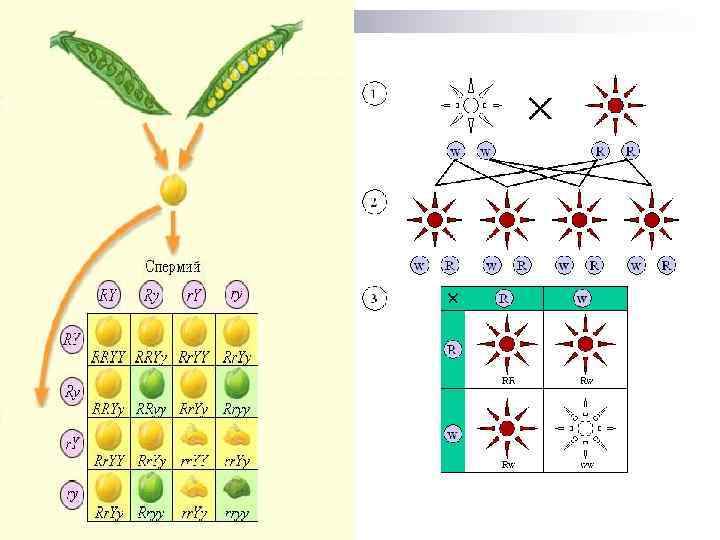 Опыты Менделя n Опыты Менделя были тщательно продуманы. Свои исследования он начал с изучения закономерностей наследования всего лишь одной пары альтернативных признаков. n Моногибридным называют скрещивание, при котором анализируется наследование одной пары альтернативных признаков. n Классическим примером моногибридного скрещивания является скрещивание сортов гороха с желтыми и зелеными семенами. При скрещивании растения с желтыми и зелеными семенами, все потомки имели желтые семена.