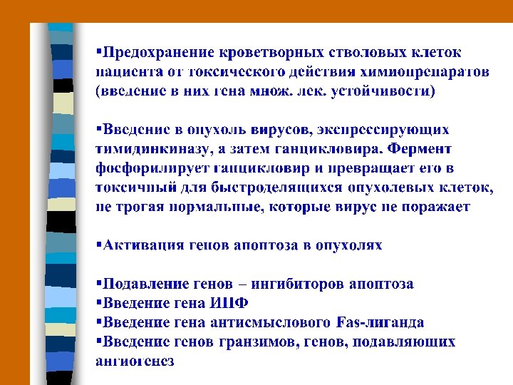 Заболевания, подвергающиеся ГТ Название Дефектный ген 1. ТКИД 1. АДА 2. Сем. Гиперхолестеринемия 2. Рецептор липопротеинов низкой плотности 3. Гемофилия В 3. Фактор IX 4. Гемофилия А 4. Фактор VIII 5. Болезнь Гоше 5. β-глюкоцероброзидаза 6. Эмфизема легких 6. α– 1 -антитрипсин 7. Муковисцедоз 7. Трансмембранный регулятор 8. Фенилкетонурия 8. Фенилаланингидроксилаза 9. Миодистрофия Дюшенна 9. Дистрофин 10. Талассемия 10. β-глобин 11. Серповид. Анемия 11. β-глобин