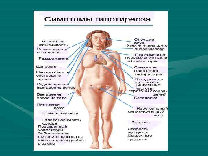 • При гипотиреозе часто поражается сердечно-сосудистая система и развивается брадикардия, артериальная гипотензия. Часто встречаются изменения желудочнокишечного тракта, склонность к запорам, метеоризм в связи с ослаблением двигательной функции кишечника. • По мере прогрессирования заболевания нарастают расстройства центральной нервной системы (ЦНС) вялость, апатия, сонливость, нарушение психики вплоть до психоза с депрессией и т. д. • Характерно нарушение функции половой системы снижение либидо у мужчин, нерегулярный менструальный цикл у женщин. • Выраженный гипотиреоз (микседема) с массивным отложением мукополисахаридов в ткани железы обычно бывает идиопатическим и развивается постепенно. При микседеме особенно заметны перечисленные симптомы, в частности изменения кожи, брадикардия, накопление жидкости в полостях, увеличение языка в размерах, изменения ЦНС.
